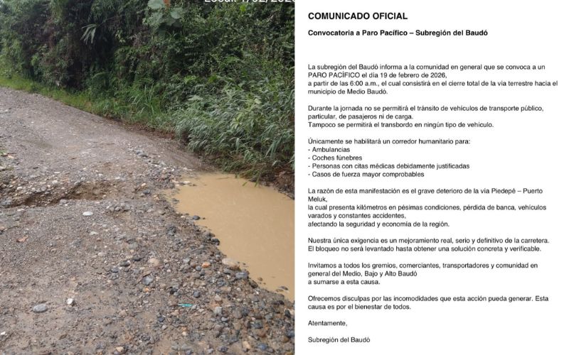 A pesar de la voluntad de diálogo expresada por el mandatario local, el bloqueo mantiene su carácter indefinido. La comunidad ha sido enfática: no habilitarán el paso hasta que se instale una mesa de diálogo formal que cuente con la presencia de la Gobernación del Chocó y la Alcaldía de Medio Baudó.
