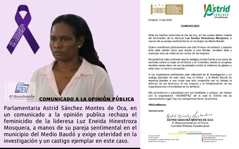 Parlamentaria Astrid Sánchez Montes de Oca, en un comunicado a la opinión pública rechaza el feminicidio de la lideresa Luz Eneida Hinestroza Mosquera, en el municipio del Medio Baudó. La parlamentaria chocoana exige celeridad en la investigación y un castigo ejemplar en este caso. Ante los hechos… 14 octubre, 2025 La Procuraduría General de la República formuló cargo a la secretaria de Educación del Chocó, Yina Paola Reales Moreno. La Procuraduría General de la Nación formuló pliego de cargos a la secretaria de Educación de Chocó, Yina… 13 octubre, 2025 Feminicidio conmociona la comunidad de Tanando, jurisdicción del municipio del Atrato – Chocó. Sociedad, Tanando, Atrato – Chocó || Una profunda ola de consternación y rechazo sacude a la comunidad de… 13 octubre, 2025