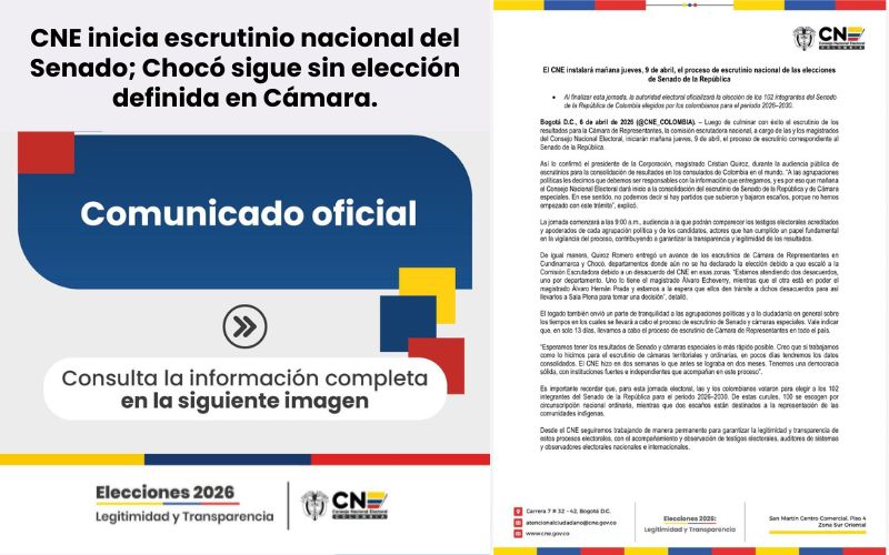CNE inicia escrutinio nacional del Senado; Chocó sigue sin elección definida en Cámara. El Consejo Nacional Electoral (CNE) anunció que este jueves 9 de abril comenzará el escrutinio nacional de las… 8 abril, 2026 Un nuevo liderazgo surge desde Bojayá con incidencia departamental Por: Alter Onesis Mosquera. Desde que comenzó este periodo de gobierno de los mandatarios locales en el departamento,… 8 abril, 2026 Juzgado de Quibdó admite Acción Popular contra DISPAC pero niega instalación inmediata de paneles solares. QUIBDÓ, 01 de septiembre de 2025 || El Juzgado Cuarto Administrativo del Circuito de Quibdó admitió formalmente una… 6 abril, 2026 Tribunal Administrativo del Chocó admite acción popular contra DISPAC El Tribunal Administrativo del Chocó informó a la comunidad en general sobre la admisión de una acción popular… 6 abril, 2026 Keybin Palacios Mosquera brilla en Argentina: doblete y liderazgo goleador con Ferro. El talento chocoano sigue dando de qué hablar en el fútbol argentino. El joven delantero Keybin Palacios Mosquera… 5 abril, 2026