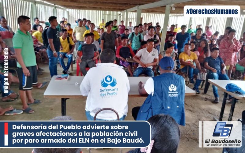 Defensoría del Pueblo advierte sobre graves afectaciones a la población civil por paro armado del ELN en el Bajo Baudó. Bogotá, 18 de marzo de 2026 || La Defensoría del Pueblo expresa su profunda preocupación por el paro… 18 marzo, 2026 Defensoría y Acnur redefinen estrategia conjunta frente a la agudización de la crisis humanitaria en el departamento del Chocó. Con el propósito de priorizar la protección de las comunidades más vulnerables en el departamento del Chocó, la… 18 marzo, 2026 Capturan a cuatro presuntos integrantes del Clan del Golfo en el departamento del Chocó En desarrollo de una operación conjunta y coordinada, tropas del Gaula Militar Urabá y del Batallón Voltígeros de… 18 marzo, 2026 Confinamiento armado del ELN deja más de 6.000 personas afectadas en el Bajo Baudó – Chocó. La Gobernación del Chocó alertó sobre el confinamiento ilegal de 6.047 personas pertenecientes a 16 comunidades afros y… 17 marzo, 2026 Ejército ubica y destruye depósito ilegal del ELN en zona rural del Chocó En la vereda La Italia, jurisdicción del municipio de San José del Palmar, tropas de la Brigada 15… 17 marzo, 2026